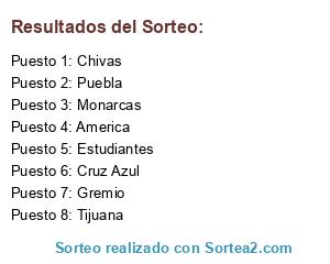 Lista de participantes: America, Chivas, Cruz Azul, Puebla, Monarcas, Gremio, Tijuana, Estudiantes.