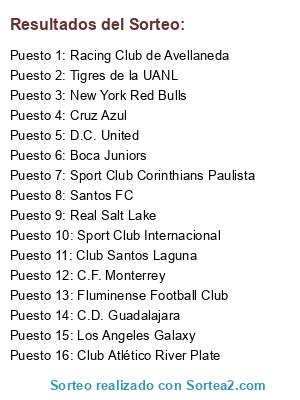 Lista de participantes: C.D. Guadalajara, Cruz Azul, Tigres de la UANL, C.F. Monterrey, Club Santos Laguna, Sport Club Corinthians Paulista, Fluminense Football Club, Sport Club Internacional, Santos FC, Los Angeles Galaxy, New York Red Bulls, D.C. United, Real Salt Lake, Boca Juniors, Racing Club de Avellaneda, Club Atlético River Plate.