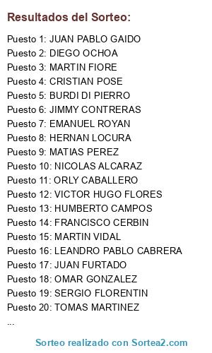 Lista de participantes: BURDI DI PIERRO, CRISTIAN POSE, DIEGO OCHOA, EMANUEL ROYAN, FRANCISCO CERBIN, GABRIEL CM, HERNAN LOCURA, HUMBERTO CAMPOS, JIMMY CONTRERAS, JORGE JAIMEZ, JUAN FURTADO, JUAN PABLO GAIDO, LEANDRO PABLO CABRERA, MARTIN FIORE, MARTIN VIDAL, MATIAS PEREZ, NICOLAS ALCARAZ, OMAR GONZALEZ, ORLY CABALLERO, SERGIO FLORENTIN, TOMAS MARTINEZ, VICTOR HUGO FLORES.