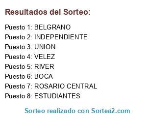 Lista de participantes: BOCA, BELGRANO, RIVER, INDEPENDIENTE, ROSARIO CENTRAL, UNION, ESTUDIANTES, VELEZ.