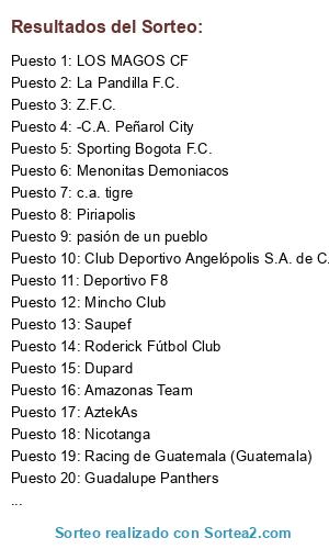 Lista de participantes: Roderick Fútbol Club, Nicotanga, Z.F.C., c.a. tigre, Deportivo F8, Club Deportivo Angelópolis S.A. de C.V., Menonitas Demoniacos, La Pandilla F.C., AztekAs, Saupef, Patrola Sport Clube, Atlethic Club Noviembre, EL BENI F.C., juan_azul, LimpBizkit F.C., Amazonas Team, Guadalupe Panthers, militares do futebol, stars goal soccer club, Alianza_Grone, Saint Germain F.C., incaicos, pasión de un pueblo, Sporting Bogota F.C., LOS MAGOS CF, Dupard, Piriapolis, Mincho Club, -C.A. Peñarol City, Racing de Guatemala (Guatemala), Puntarenas F.C. (Costa Rica), Hiroshima Momiji Manju (Japón).