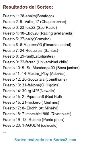 Lista de participantes: 1-AGUDM (colocolo), 2- Pipoman8 (Red Bull), 4-Fista_88 (Velez), 5- Sr_Mandanga00 (Boca juniors), 6-Miguecs93 (Rosario central), 7-intocable1986 (River plate), 8- Ekohh (At.Mineiro), 9- Valle_17 (Chapecoense), 10- Pacoeste (Huracan), 11- Dj__Luian (Flamengo), 12-Xavire (Defensa y justicia), 13- Rulerio (Ponte petra), 14-Mestre_Play (Adovilsi), 15- Chipi90 (Sp.Cristal), 16- Javicuenca (, 17-fabianorz (Paranaense), 18-Eboy20 (Racing avellaneda), 19-Manuwatgata(At.túcuman), 20-Soccatala (corinthians), 21-rockero ( Quilmes), 22-ferrari (Universidad chile), 23-luis22 (Sao Paulo), 24-Roqueluis (Santos), 25-luismax (Union Española), 26-elfiera(Fluminense), 27-balty(Cruzeiro), 28-abaito(Botafogo), 29-raul(Estudiantes), 30-rg1425(Newells), 31-falkone(O´Higgins), 32-alr-lopez1989(CD Palestino), 33-JaviRomero(Santiago Wanderers).