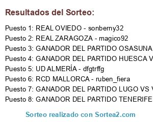Lista de participantes: GANADOR DEL PARTIDO HUESCA VS CÓRDOBA, GANADOR DEL PARTIDO OSASUNA VS NUMANCIA, RCD MALLORCA - ruben_fiera, GANADOR DEL PARTIDO LUGO VS VALLADOLID, UD ALMERÍA - dfgtrffg, GANADOR DEL PARTIDO TENERIFE VS ALAVÉS, REAL ZARAGOZA - magico92, REAL OVIEDO - sonberny32.