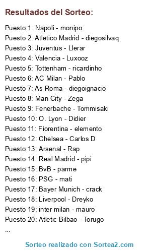 Lista de participantes: Napoli - monipo, Atletico Madrid - diegosilvaq, Juventus - Llerar, Valencia - Luxooz, Tottenham - ricardinho, AC Milan - Pablo, As Roma - diegoignacio, Man City - Zega, Fenerbache - Tommisaki, O. Lyon - Didier, Fiorentina - elemento, Chelsea - Carlos D, Arsenal - Rap, Real Madrid - pipi, BvB - parme, PSG - mati, Bayer Munich - crack, Liverpool - Dreyko, inter milan - mauro, Atletic Bilbao - Torugo, Wolfburgo - castro7, Man United - Fbn.