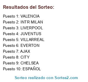 Lista de participantes: AJAX, VALENCIA, ESPAÑOL, CHELSEA, EVERTON, LIVERPOOL, VILLARREAL, JUVENTUS, INTR MILAN, CITY.