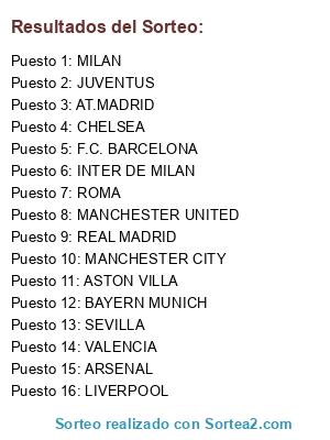 Lista de participantes: ARSENAL, LIVERPOOL, ASTON VILLA, MANCHESTER CITY, MANCHESTER UNITED, CHELSEA, AT.MADRID, REAL MADRID, F.C. BARCELONA, SEVILLA, VALENCIA, BAYERN MUNICH, ROMA, INTER DE MILAN, MILAN, JUVENTUS.
