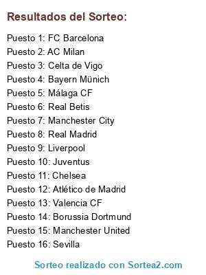 Lista de participantes: Borussia Dortmund, FC Barcelona, Sevilla, Celta de Vigo, Real Madrid, Manchester United, Chelsea, Manchester City, AC Milan, Real Betis, Málaga CF, Bayern Münich, Atlético de Madrid, Liverpool, Juventus, Valencia CF.