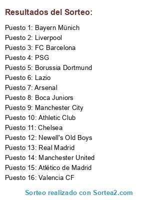 Lista de participantes: Borussia Dortmund, Lazio, FC Barcelona, Athletic Club, Boca Juniors, Manchester City, Chelsea, Bayern Münich, Real Madrid, Newell's Old Boys, PSG, Manchester United, Atlético de Madrid, Liverpool, Arsenal, Valencia CF.