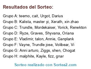 Lista de participantes: master yi, teemo, talon, gnar, fizz, cait, malphite, xin zhao, Darius, Ganplank, Vladimir, Graves, Kayle, Annie, Yorick, Trundle, Mordekaiser, Ryze, Renekton, Urgot, Vayne, Oriana, Shyvana, Vi, Anni arturo, Chogat, Ziggs, Volibear, Xerath, Trundle jose, Kalista, shen.