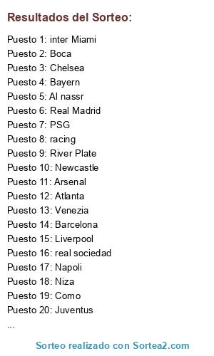 Lista de participantes: wolves, Real Madrid, River Plate, Chelsea, Porto, Barcelona, Arsenal, racing, inter Miami, Dortmund, Boca, leverkusen, Mallorca, Bayern, Girona, Aaron Villa, Leipzig, Bilbao, city, Como, Al nassr, PSG, Atlanta, real sociedad, Valencia, Juventus, Napoli, Newcastle, Niza, Venezia, Liverpool, Marsella.