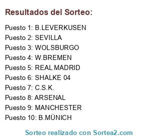 Lista de participantes: B.LEVERKUSEN, B.MÜNICH, W.BREMEN, WOLSBURGO, SHALKE 04, C.S.K., REAL MADRID, SEVILLA, ARSENAL, MANCHESTER.
