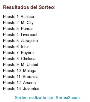 Lista de participantes: Chelsea, Inter, Malaga, Arsenal, Juventus, Zaragoza, M. United, Atletico, M. City, Bayern, Borussia, Liverpool, Pumas.