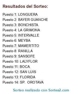 Lista de participantes: MAMERTITO, RANILLA, MEYBA, SAN LUIS, INTERVALLE, SP. OROTAVA, LONGUERA, FLORIDA, LALYFLOR, LA GRIMONA, SANSOFE, BOCA, BONCHISTA, BAYER GUANCHE.