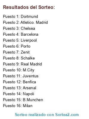 Lista de participantes: Chelsea, Benfica, Dortmund, Milan, Zenit, Juventus, Liverpool, Porto, B.Munchen, Atletico. Madrid, Barcelona, Napoli, M.City, Schalke, Arsenal, Real Madrid.