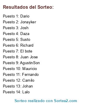 Lista de participantes: El Bote, Johan, Anderson, Fernando, Edward, Jonayker, Carlos andres, Daza, Juan Jose, Mesa, Agustin, Mamilo, Josh, Mauricio, Lalo, Harold, Dario, Camilo, Kale, Yiyo.