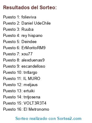 Lista de participantes: IL MURO, alexduenas9, rey hispano, escandelloso, folieviva, Deindee, xou77, Ruuba, El Metronomo, meljaus, ErMoritoRM9, Daniel UdeChile, ertuiki, VOLT3R3T4, tntlargo, tntjosena.