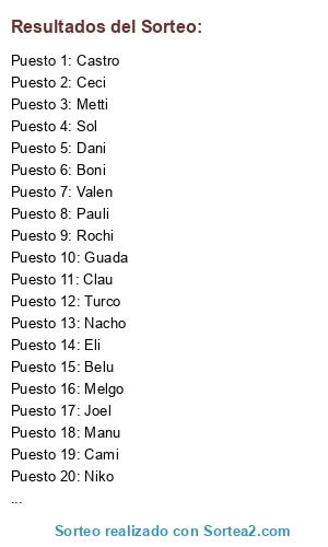 Lista de participantes: Joel, Mechi, Clau, Guada, Metti, Sol, Sebi, Eli, Melgo, Castro, Yoshi, Boni, Reus, Maypi, Turco, Pauli, Dani, Niko, Ceci, Rochi, Fache, Valen, Belu, Nacho, Cami, Manu.