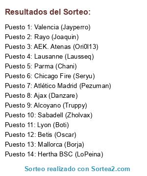 Lista de participantes: AEK. Atenas (Ori0l13), Ajax (Danzare), Alcoyano (Truppy), Atlético Madrid (Pezuman), Betis (Oscar), Chicago Fire (Seryu), Hertha BSC (LoPeina), Lausanne (Lausseq), Lyon (Boti), Mallorca (Borja), Parma (Chani), Rayo (Joaquin), Sabadell (Zholvax), Valencia (Jayperro).