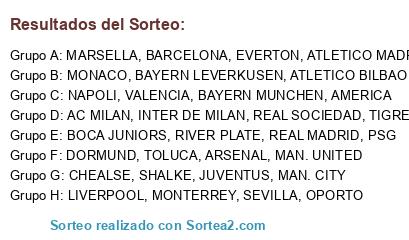 Lista de participantes: BAYERN MUNCHEN, BAYERN LEVERKUSEN, DORMUND, SHALKE, REAL MADRID, BARCELONA, ATLETICO BILBAO, ATLETICO MADRID, REAL SOCIEDAD, SEVILLA, VALENCIA, JUVENTUS, NAPOLI, AC MILAN, INTER DE MILAN, PSG, MONACO, MARSELLA, OPORTO, SPORTING, AMERICA, MONTERREY, TIGRES, TOLUCA, LIVERPOOL, MAN. CITY, MAN. UNITED, ARSENAL, CHEALSE, EVERTON, RIVER PLATE, BOCA JUNIORS.