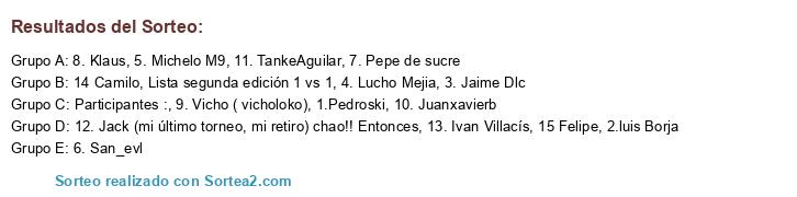 Lista de participantes: 1.Pedroski, 2.luis Borja, 3. Jaime Dlc, 4. Lucho Mejia, 5. Michelo M9, 6. San_evl, 7. Pepe de sucre, 8. Klaus, 9. Vicho ( vicholoko), 10. Juanxavierb, 11. TankeAguilar, 12. Jack (mi último torneo, mi retiro) chao!! Entonces, 13. Ivan Villacís, 14 Camilo.