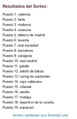 Lista de participantes: real madrid, barcelona, valencia, sevilla, atletico de madrid, atletih de bilbao, levante, getafe, betis, rayo vallecano, villareal, real sociedad, zaragoza, mallorca, malaga, osasuna, espanyol, deportivo de la coruña, racing de santander.