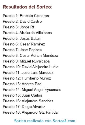 Lista de participantes: Diego Alvarez, Humberto Muñoz, Abelardo Villalobos, Jose Popoca, Jorge Rt, Alejandro Sanchez, Jesus Balam, Andres Pad, Jose Luis Marquez, Miguel Angel Eycomaic, Cesar Adrian Mendoza, Alejandro Gtz Partida, David Castro, Cesar Ramirez, David Alejandro Lucio, Miguel Ruvalcaba, Ernesto Cisneros, Juan Carlos.