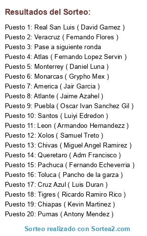 Lista de participantes: Queretaro ( Adm Francisco ), Atlas ( Fernando Lopez Servin ), Tigres ( Ricardo Ramiro Rico ), Toluca ( Pancho de la garza ), America ( Jair Garcia ), Monterrey ( Daniel Luna ), Pachuca ( Fernando Echeverria ), Monarcas ( Grypho Mex ), Real San Luis ( David Gamez ), Xolos ( Samuel Treto ), Santos ( Luiyi Edredon ), Chivas ( Miguel Angel Ramirez ), Cruz Azul ( Luis Duran ), Leon ( Armandoo Hernandezz ), Pumas ( Antony Mendez ), Puebla ( Oscar Ivan Sanchez Gil ), Chiapas ( Kevin Martinez ), Atlante ( Jaime Azahel ), Veracruz ( Fernando Flores ), Pase a siguiente ronda.