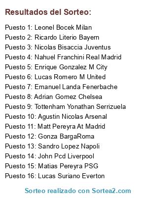 Lista de participantes: Enrique Gonzalez M City, Matt Pereyra At Madrid, Sandro Lopez Napoli, Leonel Bocek Milan, Emanuel Landa Fenerbache, Matias Pereyra PSG, Nicolas Bisaccia Juventus, Lucas Suriano Everton, Agustin Nicolas Arsenal, John Pcd Liverpool, Nahuel Franchini Real Madrid, Lucas Romero M United, Tottenham Yonathan Serrizuela, Ricardo Literio Bayern, Gonza BargaRoma, Adrian Gomez Chelsea.