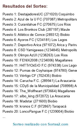 Lista de participantes: segunda ronda (284428) Los Lagos, Ayoros FC (1234181) Los Lagos, H4TTr!CkErO F.C (974338) Los Lagos, CDyS de la Municipalidad (708998) Arica y Parinacota, Deportivo Arica (971072) Arica y Parinacota, Azul de la U FC (707087) Metropolitana, Akracia FC (1236214) Metropolitana, CSD Yamigawas (1234845) Metropolitana, The_Wolfheart (973664) Magallanes, FENIX2008 (1234006) Magallanes, Real Coolicos (1235182) Magallanes, Olimpo AzUl (1238263) Los Rios, Curanilahue FC (270675) Los Rios, k_burgalacticos (973727) Los Rios, Perezoso Team (969480) Valparaiso, Ruinas de Cumming (271090) Valparaíso, LoncoPangue F.C (1239004) Biobio, Atlético de Conce (289312) Biobio, Vértigo CF (702435) Biobio, Madstar (271600) Biobio, Blackboll F.C. (968960) Antofagasta, Cruzados Asesinos (968825) Antofagasta, Los Bronkos Club (287197) Maule, albo_king (972072) La Araucania, Carucha F.C. (289941) La Araucania, Lütterick United (290712) Tarapacá, kronos C.F (972867) Tarapacá, satarip (1238107) Coquimbo, DestajadoresUC (271020) Coquimbo, Pumas de Coyhaique (974780) General Carlos Ibañez, Mauriciano (706022) General Carlos Ibañez, Reyupla (704476) Libertador Bernardo.