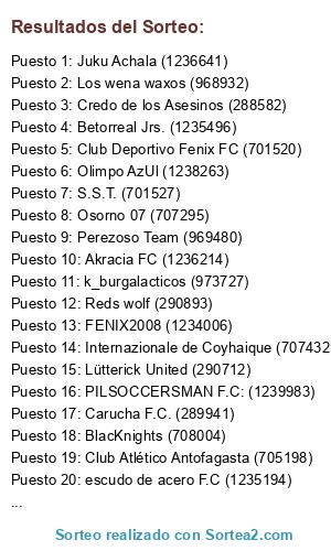 Lista de participantes: BlacKnights (708004), S.S.T. (701527), Osorno 07 (707295), Toros Osorno Futbol Club (270296), Credo de los Asesinos (288582), Juku Achala (1236641), Deportivo Arica (971072), Los wena waxos (968932), Reds wolf (290893), Akracia FC (1236214), Mafia Ovejera (290436), FENIX2008 (1234006), Wanchester (707247), Perezoso Team (969480), Ruinas de Cumming (271090), Club Deportivo Fenix FC (701520), Olimpo AzUl (1238263), k_burgalacticos (973727), escudo de acero F.C (1235194), Vértigo CF (702435), Madstar (271600), LoncoPangue F.C (1239004), PILSOCCERSMAN F.C: (1239983), Carucha F.C. (289941), Club Atlético Antofagasta (705198), Los Bronkos Club (287197), Dragones Celestes F.C. (970660), Lütterick United (290712), Betorreal Jrs. (1235496), DestajadoresUC (271020), rockthedragon (704065), Internazionale de Coyhaique (707432).