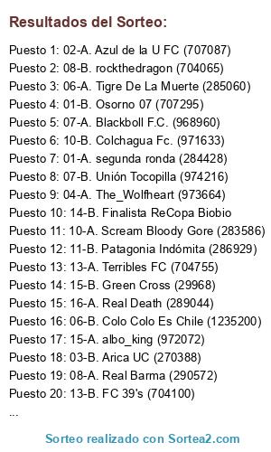 Lista de participantes: 01-A. segunda ronda (284428), 02-A. Azul de la U FC (707087), 03-A. Piratalbo FC (975944), 04-A. The_Wolfheart (973664), 05-A. Olimpo AzUl (1238263), 06-A. Tigre De La Muerte (285060), 07-A. Blackboll F.C. (968960), 08-A. Real Barma (290572), 09-A. Ya tu Saez (972175), 10-A. Scream Bloody Gore (283586), 11-A. Pumas de Coyhaique (974780), 12-A. Toros Osorno Futbol Club (270296), 13-A. Terribles FC (704755), 14-A. Campeón ReCopa Biobio, 15-A. albo_king (972072), 16-A. Real Death (289044), 01-B. Osorno 07 (707295), 02-B. Eterno Campeon F.C (969894), 03-B. Arica UC (270388), 04-B. Ceatolei F.C (702931), 05-B. Rancho Mallea S.A (705133), 06-B. Colo Colo Es Chile (1235200), 07-B. Unión Tocopilla (974216), 08-B. rockthedragon (704065), 09-B. Lütterick United (290712), 10-B. Colchagua Fc. (971633), 11-B. Patagonia Indómita (286929), 12-B. Cervecero Austral FC (286311), 13-B. FC 39's (704100), 14-B. Finalista ReCopa Biobio, 15-B. Green Cross (29968), 16-B. satarip (1238107).