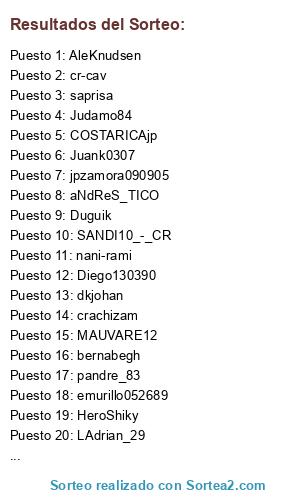 Lista de participantes: Nagasaki_CR, cartapopchile, Juank0307, crachizam, pandre_83, SANDI10_-_CR, Judamo84, AleKnudsen, CHCR_13, COSTARICAjp, costa_rica1, Duguik, taninike10, aNdReS_TICO, dragoncr11, bernabegh, jopa_07, nani-rami, jpzamora090905, LAdrian_29, juanbarquerof, MAUVARE12, Mariovare, cr-cav, Diego130390, saprisa, jorgep64, emurillo052689, tavobarboza, dkjohan, jcarr77, HeroShiky.