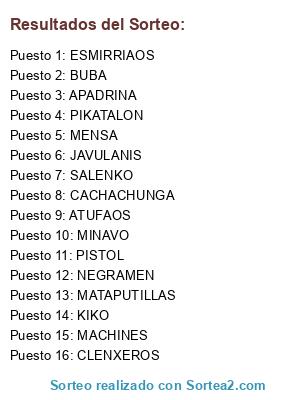 Lista de participantes: JAVULANIS, MENSA, KIKO, BUBA, PISTOL, ESMIRRIAOS, CLENXEROS, NEGRAMEN, ATUFAOS, SALENKO, APADRINA, MINAVO, MATAPUTILLAS, MACHINES, CACHACHUNGA, PIKATALON.