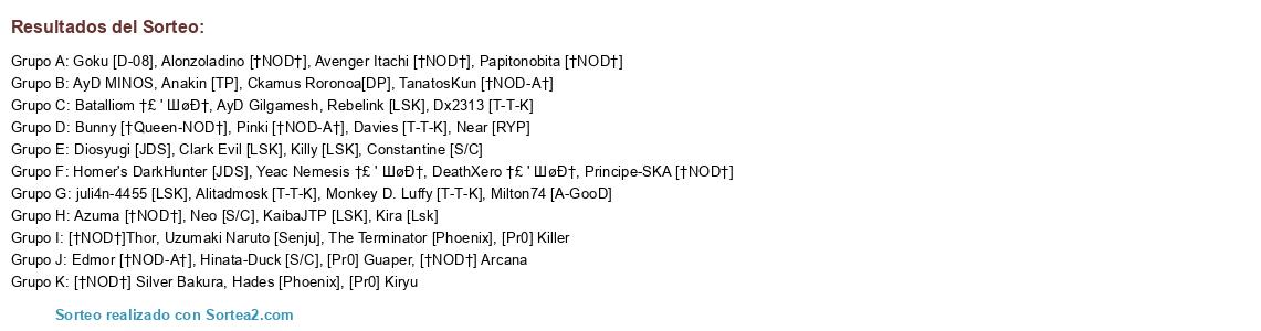 Lista de participantes: Avenger Itachi [†NOD†], Principe-SKA [†NOD†], Alonzoladino [†NOD†], Papitonobita [†NOD†], Bunny [†Queen-NOD†], Pinki [†NOD-A†], [†NOD†]Thor, TanatosKun [†NOD-A†], [†NOD†] Silver Bakura, [†NOD†] Arcana, Azuma [†NOD†], Edmor [†NOD-A†], Alitadmosk [T-T-K], Dx2313 [T-T-K], Davies [T-T-K], Monkey D. Luffy [T-T-K], AyD MINOS, AyD Gilgamesh, DeathXero †£ ' ШøĐ†, Batalliom †£ ' ШøĐ†, Yeac Nemesis †£ ' ШøĐ†, Hades [Phoenix], The Terminator [Phoenix], [Pr0] Kiryu, [Pr0] Killer, [Pr0] Guaper, Kira [Lsk], KaibaJTP [LSK], Clark Evil [LSK], Rebelink [LSK], Killy [LSK], juli4n-4455 [LSK], Ckamus Roronoa[DP], Anakin [TP], Diosyugi [JDS], Homer's DarkHunter [JDS], Milton74 [A-GooD], Uzumaki Naruto [Senju], Goku [D-08], Near [RYP], Constantine [S/C], Hinata-Duck [S/C], Neo [S/C].