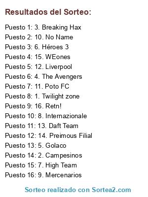 Lista de participantes: 1. Twilight zone, 2. Campesinos, 3. Breaking Hax, 4. The Avengers, 5. Golaco, 6. Héroes 3, 7. High Team, 8. Internazionale, 9. Mercenarios, 10. No Name, 11. Poto FC, 12. Liverpool, 13. Daft Team, 14. Preimous Filial, 15. WEones, 16. Retn!.