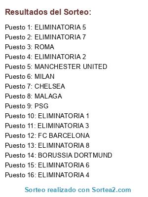 Lista de participantes: FC BARCELONA, BORUSSIA DORTMUND, MANCHESTER UNITED, ROMA, MALAGA, MILAN, PSG, CHELSEA, ELIMINATORIA 1, ELIMINATORIA 2, ELIMINATORIA 3, ELIMINATORIA 4, ELIMINATORIA 5, ELIMINATORIA 6, ELIMINATORIA 7, ELIMINATORIA 8.