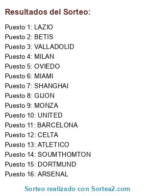 Lista de participantes: BETIS, LAZIO, SOUMTHOMTON, MILAN, SHANGHAI, BARCELONA, MONZA, ARSENAL, CELTA, DORTMUND, OVIEDO, MIAMI, GIJON, UNITED, VALLADOLID, ATLETICO.