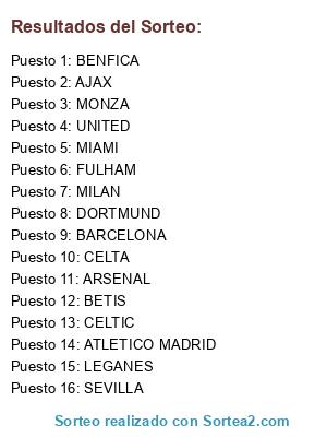 Lista de participantes: CELTA, MIAMI, ATLETICO MADRID, CELTIC, FULHAM, ARSENAL, LEGANES, BETIS, MILAN, BENFICA, SEVILLA, MONZA, BARCELONA, UNITED, DORTMUND, AJAX.