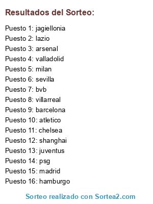 Lista de participantes: bvb, atletico, sevilla, milan, lazio, jagiellonia, psg, villarreal, hamburgo, arsenal, valladolid, madrid, juventus, shanghai, chelsea, barcelona.