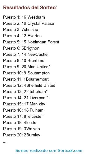 Lista de participantes: 1Bournemout, 2Burnley, 3Wolves, 4leeds, 4Sheffield United, 6Brigthon, 7chelsea, 8 leicester, 9 Soutampton, 10 Brentford, 11 Arsenal, 12 Everton, 13 Aston Villa, 14 NewCastle, 15 Nottimgan Forest, 17 Man city, 16 Westham, 18 Fulham, 19 Crystal Palace, 20 Man United*, 21 Liverpool*, 22 totteham*.