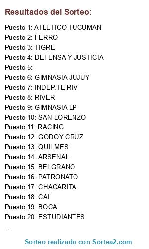 Lista de participantes: ARSENAL, BELGRANO, GIMNASIA LP, QUILMES, FERRO, ESTUDIANTES, TIGRE, INSTITUTO, SAN LORENZO, VELEZ, DEFENSA Y JUSTICIA, BOCA, NEWELLS, PATRONATO, SAN MARTIN SAN JUAN, GIMNASIA JUJUY, CHACARITA, RIVER, BANFIELD, ALL BOYS, INDEP.TE RIV, RACING, ATLETICO TUCUMAN, CAI, GODOY CRUZ, .