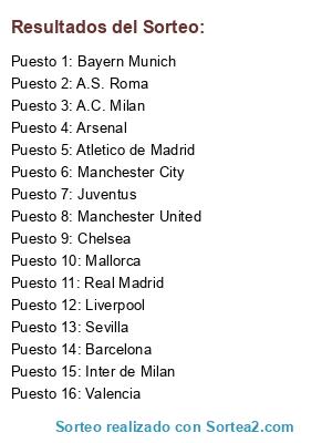 Lista de participantes: Barcelona, Real Madrid, Atletico de Madrid, Sevilla, Valencia, Mallorca, Manchester United, Chelsea, Liverpool, Arsenal, Manchester City, Inter de Milan, A.C. Milan, A.S. Roma, Juventus, Bayern Munich.