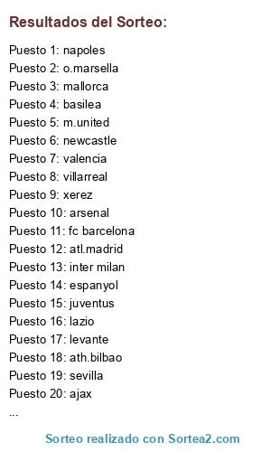 Lista de participantes: napoles, ath.bilbao, inter milan, liverpool, r.madrid, newcastle, deportivo, lazio, b.munich, juventus, m.united, tottenham, o.marsella, ajax, ac milan, roma, zaragoza, palermo, sevilla, mallorca, udinese, xerez, basilea, granada, villarreal, arsenal, fc barcelona, atl.madrid, valencia, levante, rayo vallecano, espanyol.