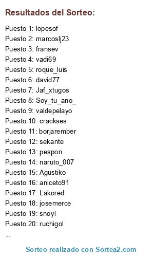 Lista de participantes: Jaf_xtugos, aniceto91, crackses, nensilagoness, valdepelayo, Lakored, roque_luis, miguelasa, juancarlos39, praillos85, sodast, prisler, jliy0, david77, Soy_tu_ano_, sekante, ruchigol, fransev, pespon, josemerce , vadi69 , borjarember , longchakal , lopesof , snoyl , marcoslj23 , arcalle , joseboada5 , luis_22, Agustiko , Nore_Vander, naruto_007.