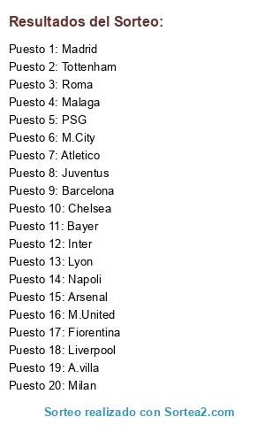Lista de participantes: M.United, Barcelona, Madrid, Milan, M.City, Juventus, Bayer, Inter, Chelsea, Tottenham, Arsenal, Atletico, PSG, Lyon, Roma, Liverpool, Fiorentina, Napoli, Malaga, A.villa.