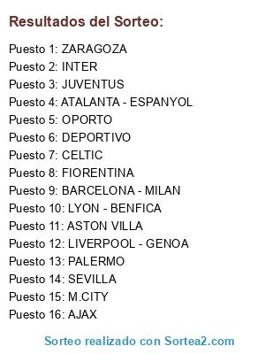 Lista de participantes: BARCELONA, REAL MADRID, DEPORTIVO, VILLAREAL, VALENCIA, ZARAGOZA, SEVILLA, ESPANYOL, M.UNITED, LIVERPOOL, EVERTON, CHELSEA, TOTTENHAM, ARSENAL, M.CITY, ASTON VILLA, JUVENTUS, MILAN, INTER, ROMA, PALERMO, GENOA, FIORENTINA, ATALANTA, AJAX, OLIMPYACOS, OPORTO, BENFICA, LYON, MARSELLA, CELTIC, GIRONDINS.