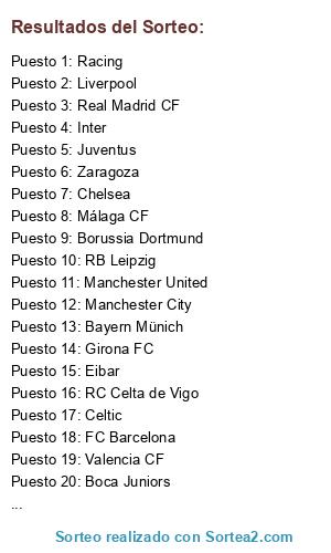 Lista de participantes: Arsenal, Racing, Girona FC, Real Madrid CF, Eibar, Juventus, FC Barcelona, Rayo Vallecano, Chelsea, RB Leipzig, Manchester United, RC Celta de Vigo, PSG, Liverpool, Bayern Münich, Manchester City, Málaga CF, Valencia CF, Levante UD, Boca Juniors, Inter, Celtic, Zaragoza, Borussia Dortmund.