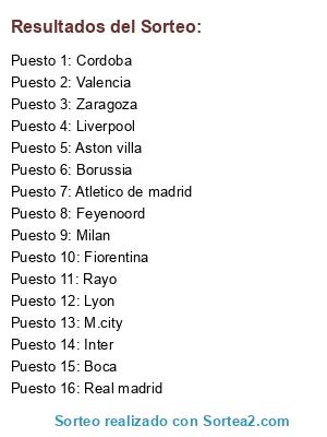 Lista de participantes: Zaragoza, Valencia, Lyon, Inter, Milan, Boca, Liverpool, Rayo, M.city, Aston villa, Fiorentina, Cordoba, Real madrid, Borussia, Atletico de madrid, Feyenoord.
