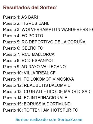 Lista de participantes: AD RAYO VALLECANO, AS BARI, BORUSSIA DORTMUND, FC LOKOMOTIV MOSKVA, RCD ESPANYOL, TOTTENHAM HOTSPUR FC, FC INTERNACIONALE, REAL BETIS BALOMPIE, CELTIC FC, WOLVERHAMPTON WANDERERS FC, RC DEPORTIVO DE LA CORUÑA, CLUB ATLETICO DE MADRID SAD, TIGRES UANL, FC PORTO, RCD MALLORCA, VILLARREAL CF.
