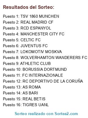 Lista de participantes: RCD ESPANYOL, JUVENTUS FC, RC DEPORTIVO DE LA CORUÑA, AS ROMA, REAL BETIS, LOKOMOTIV MOSKVA, MANCHESTER CITY FC, WOLVERHAMTON WANDERERS FC, CELTIC FC, TIGRES UANL, ATHLETIC CLUB, REAL MADRID CF, AS BARI, TSV 1860 MUNCHEN, BORUSSIA DORTMUND, FC INTERNAZIONALE.